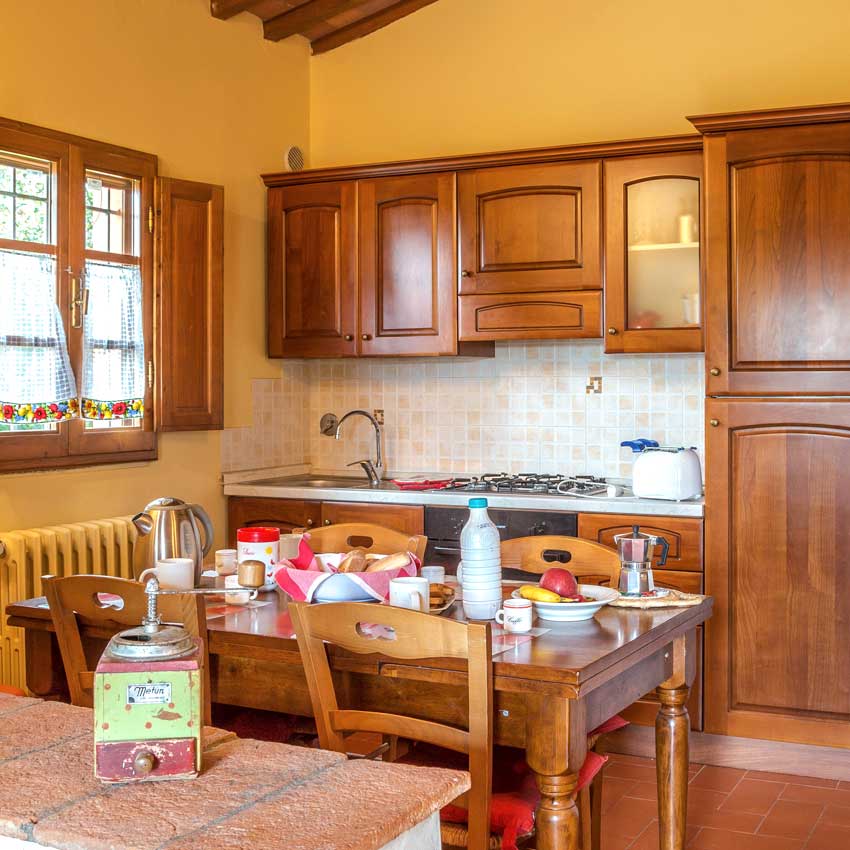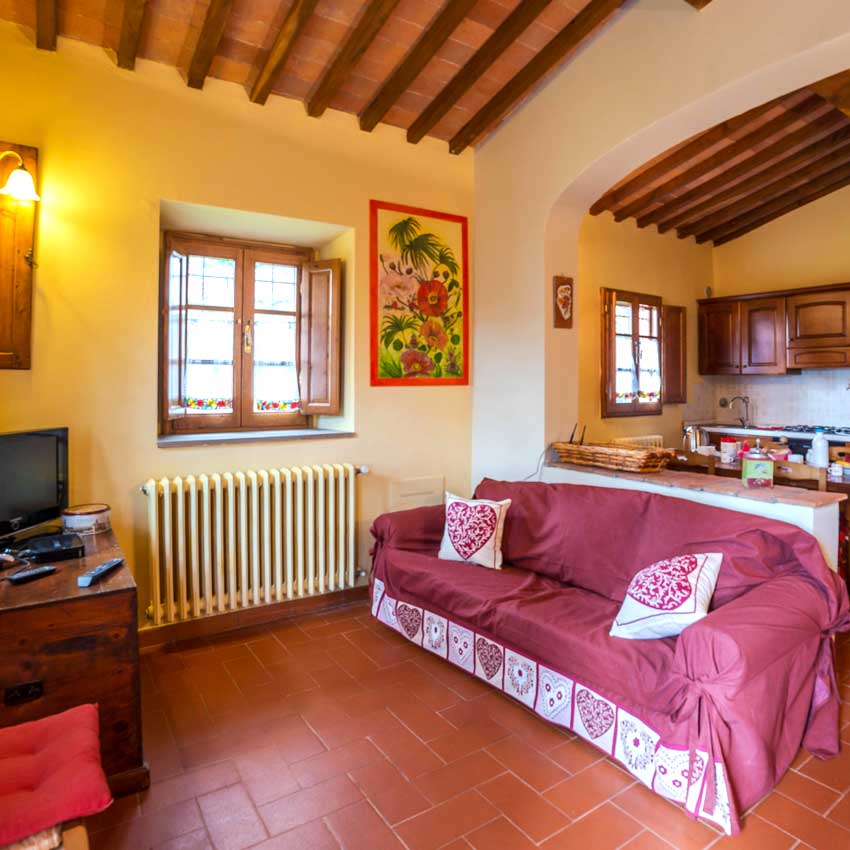 The stylish living room with flat-screen TV and air conditioning is perfect for relaxing after a long day of exploring, and the fully furnished kitchenette with all necessary amenities makes meal prep a breeze.